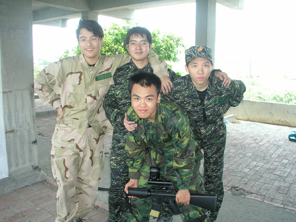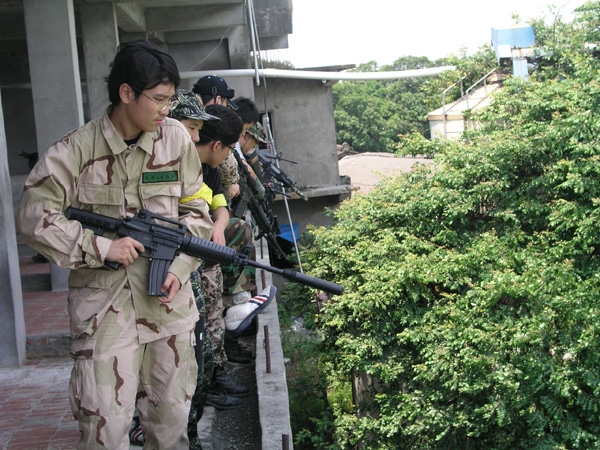 在我幹掉他後遇到八釐米,他叫我們有機會就進攻,不要一直僵持在這裡。(要不然怎麼叫攻方呢?)接著我就到民房二樓去,BOSS和其他三人在上面,跟雞舍內的敵人互相開火,我則去支援他們,守左翼。(因為我是左撇子ㄇ......)可是竟然有一人躲在廢棄房間內,把槍管從門縫伸出,對我喊「咻、咻」告訴我,我已經被他陣亡了。(近距離不開槍,用講的代替,生存遊戲規則),一開始我沒注意到,誰會去注意到門縫呀,所以我也不知道我陣亡了,結果那人要開門走出來告訴我我掛了,但是他突然出現反而被他同伴誤以為是敵人攻擊。就在這時,鈴聲響起,時間到,這場已經結束了。